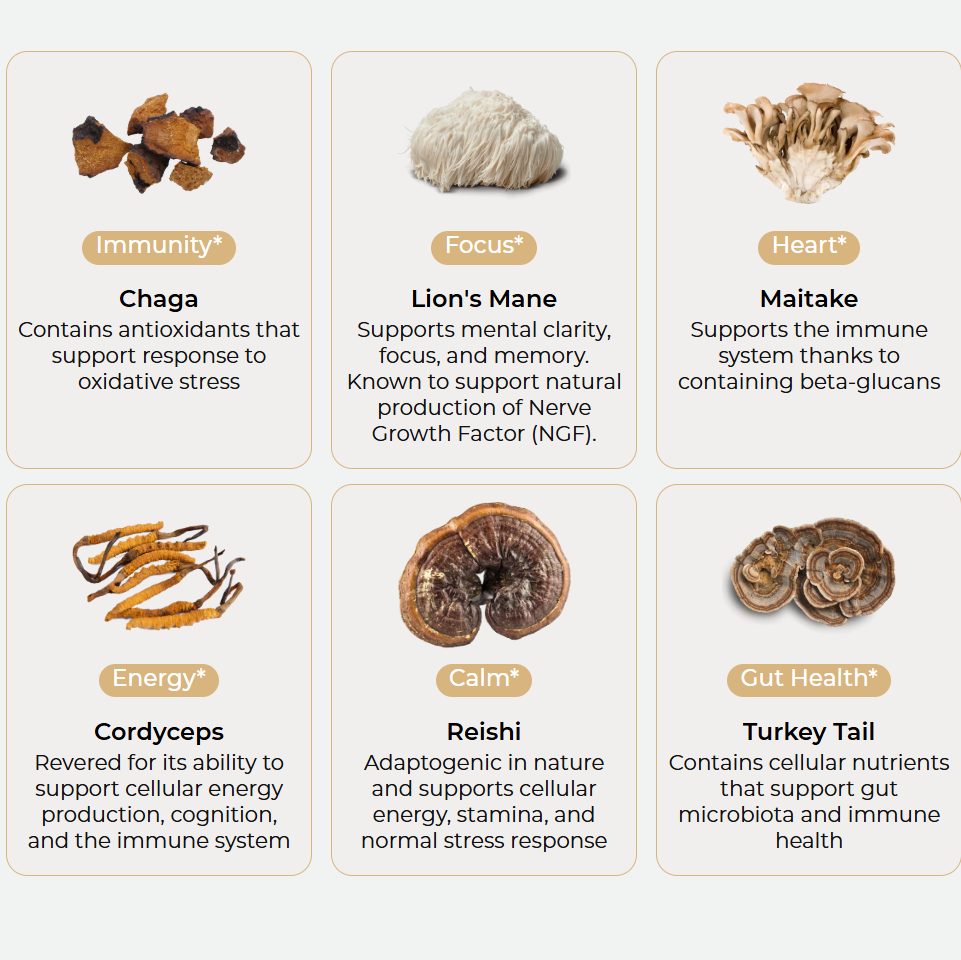 A powerful and unique mushroom supplement thatsupports brain function, immune system health, gut health, and mood.Made to take every day as part of your daily routine.