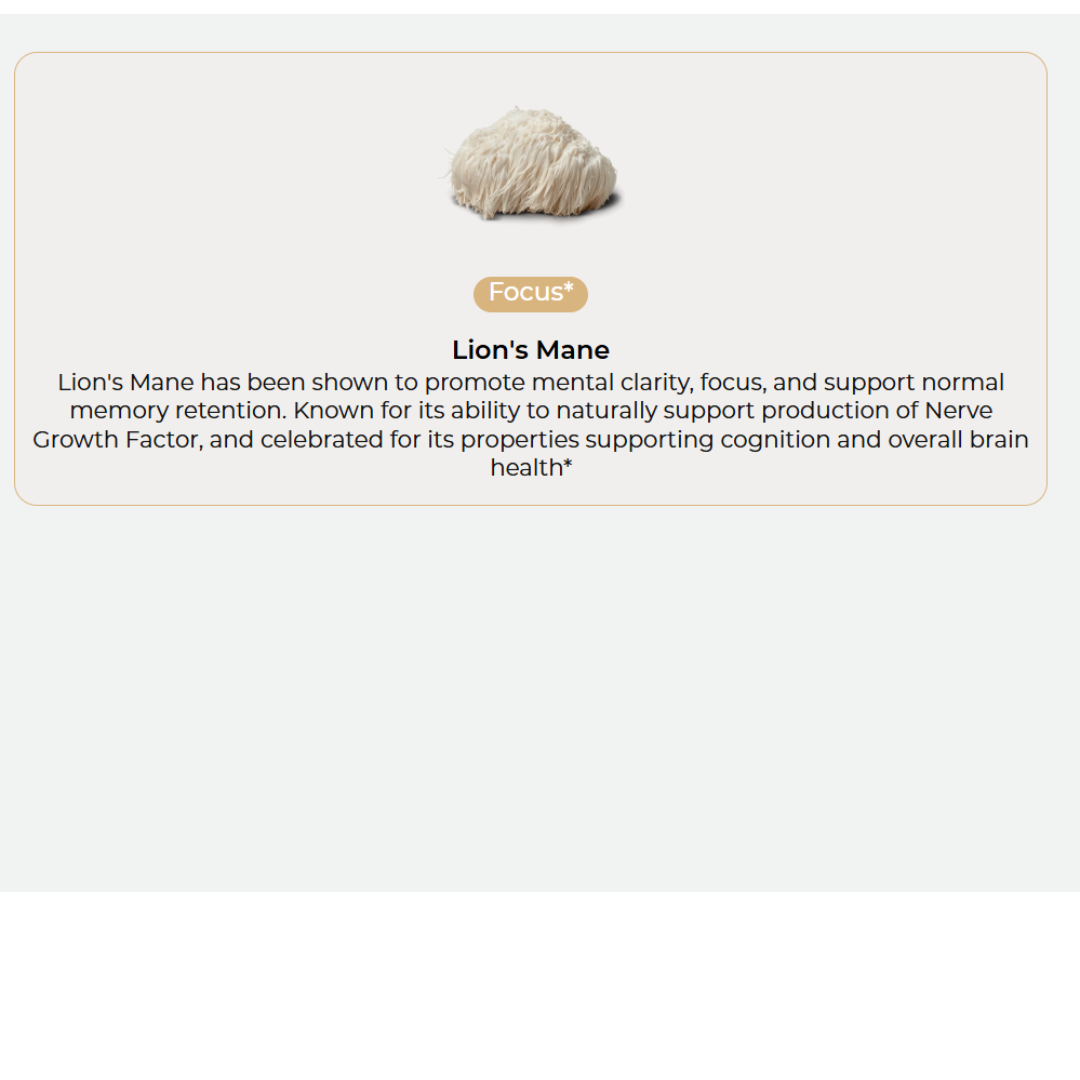 A fusion of Lion's Mane and brain function supporting nutrients, blended to support mental clarity, concentration, and daily focus. Crafted for daily consumption, it's the cognitive support you've been waiting for